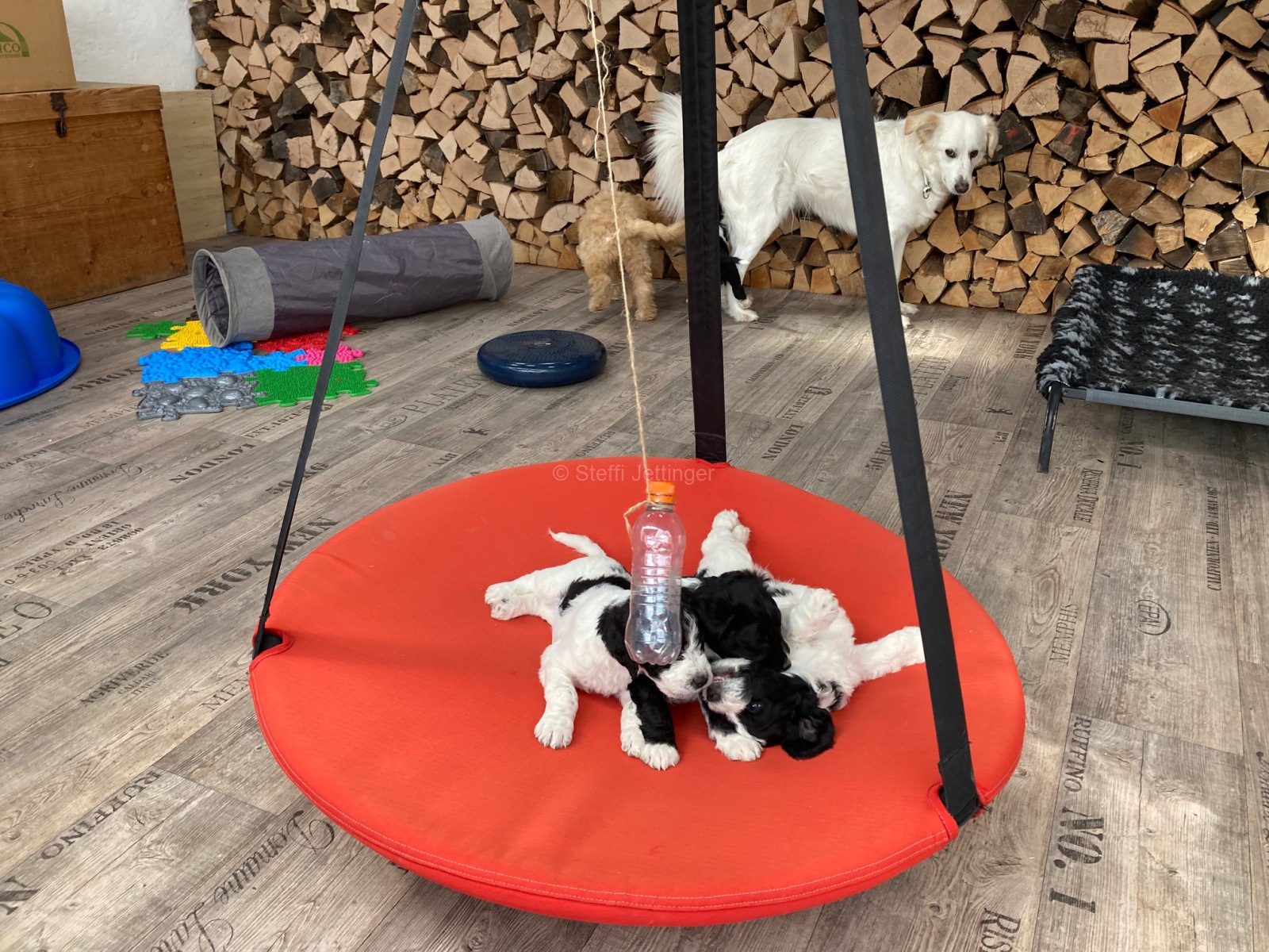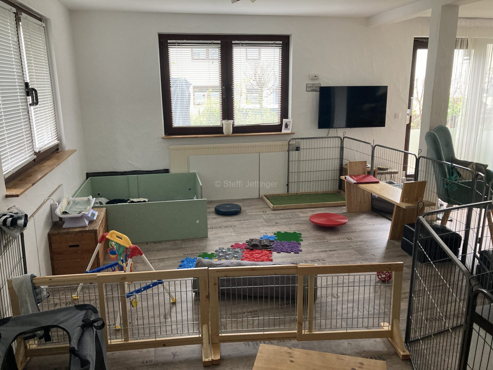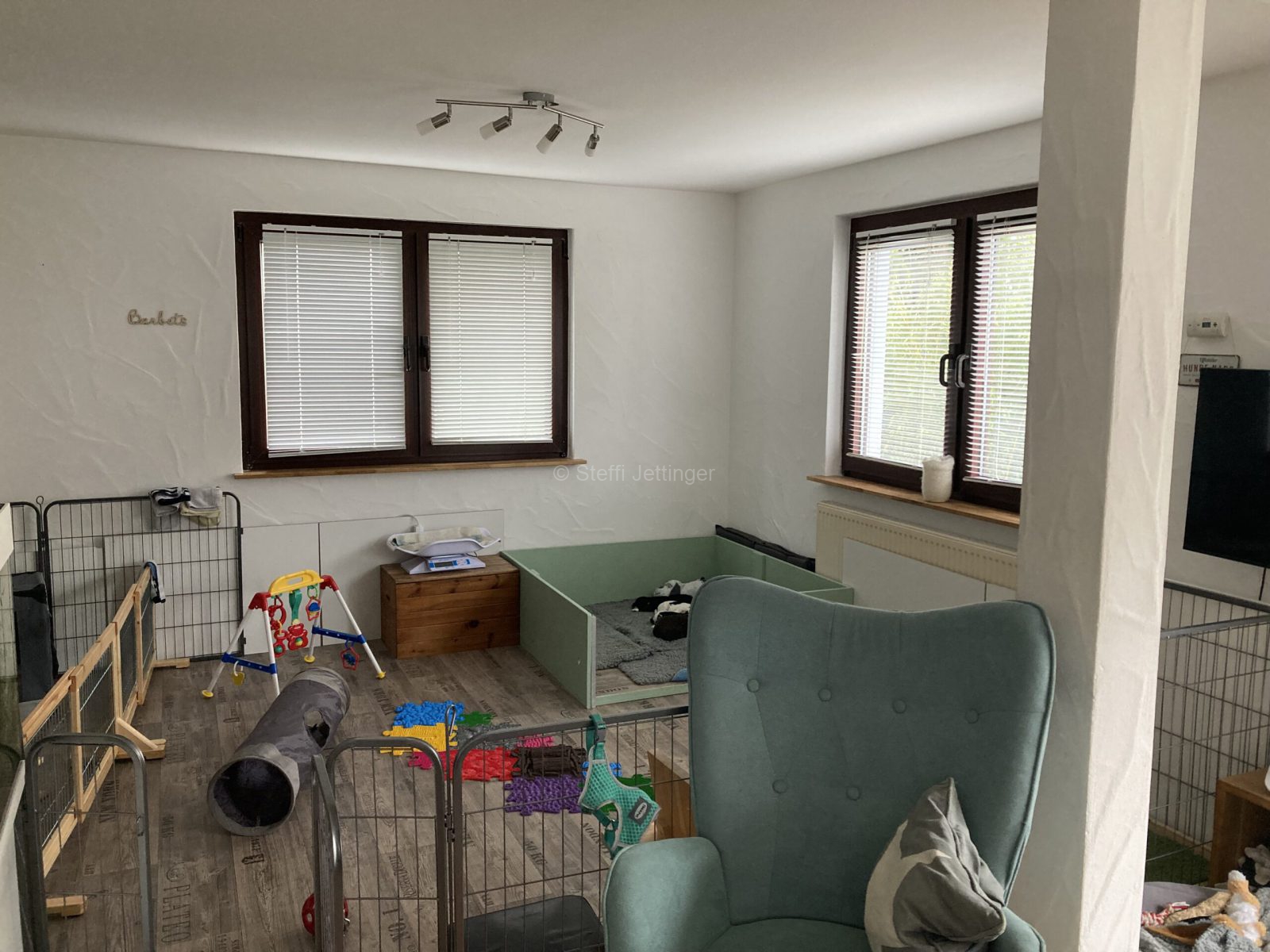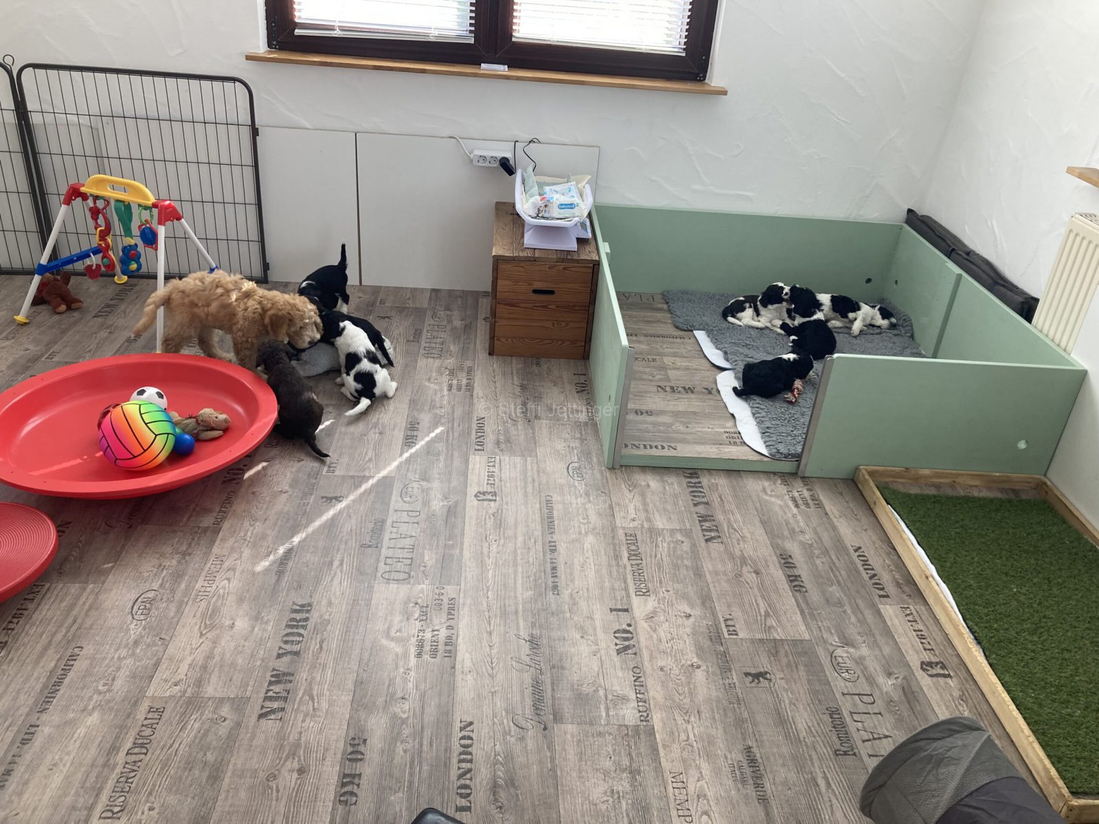 Meine Welpen wachsen Mitten in unserem Familienleben auf. Hier lernen Sie schon im vertrauten Welpenauslauf verschiedene Alltagsgeräusche wie z. B. Spülmaschine, Kochgeräusche, Staubsauger, Türklingel, Radio, TV und vieles mehr kennen.