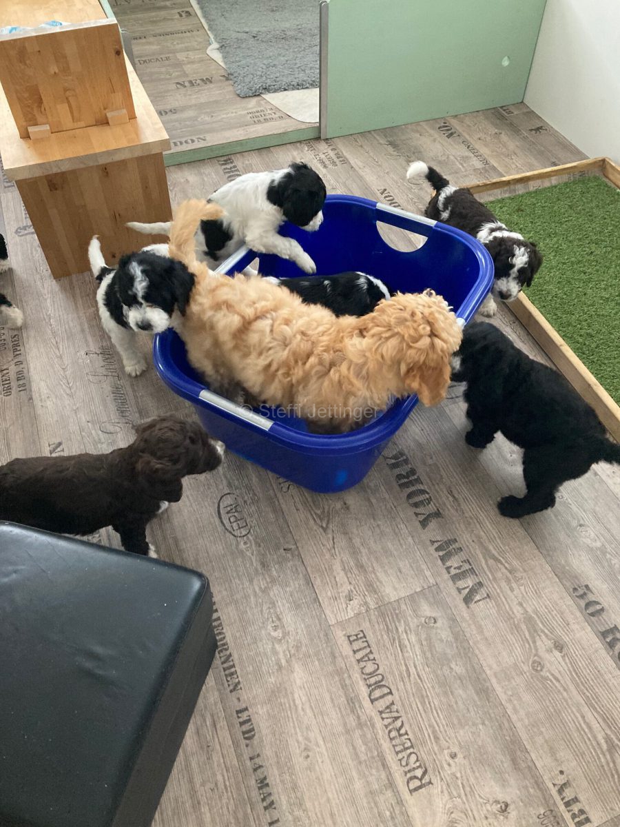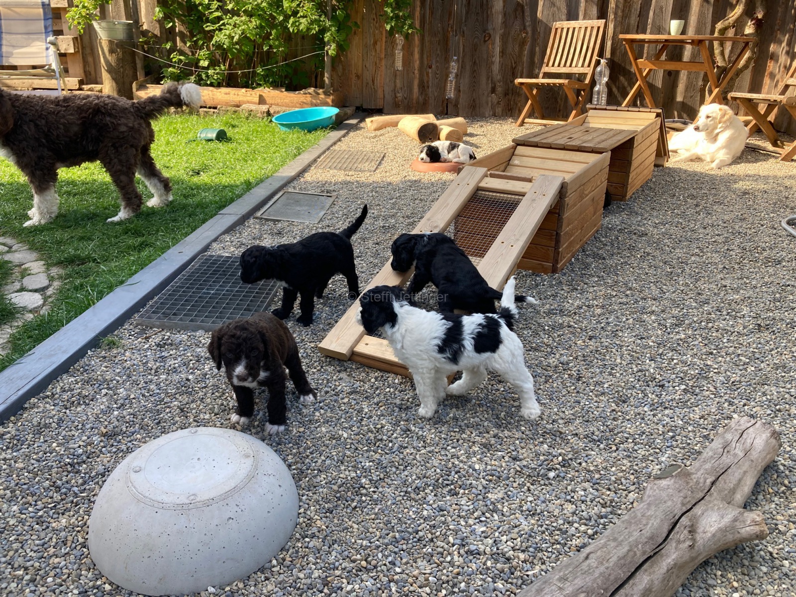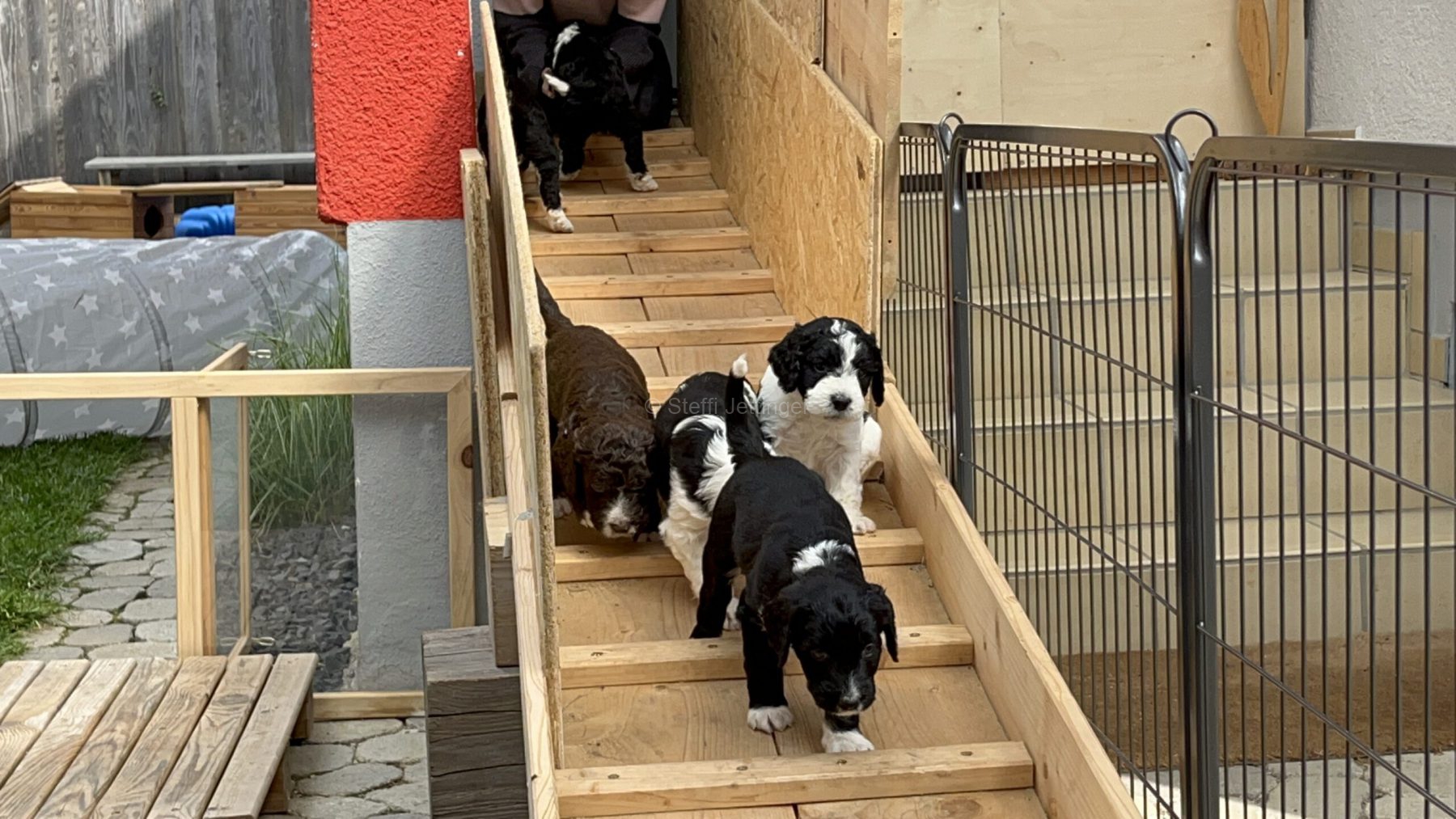 Meine Welpen wachsen Mitten in unserem Familienleben auf. Hier lernen Sie schon im vertrauten Welpenauslauf verschiedene Alltagsgeräusche wie z. B. Spülmaschine, Kochgeräusche, Staubsauger, Türklingel, Radio, TV und vieles mehr kennen.
