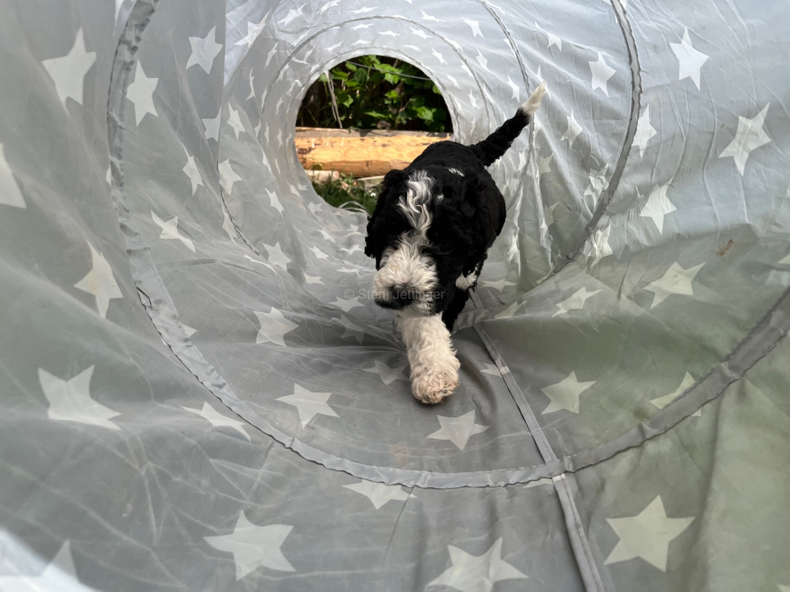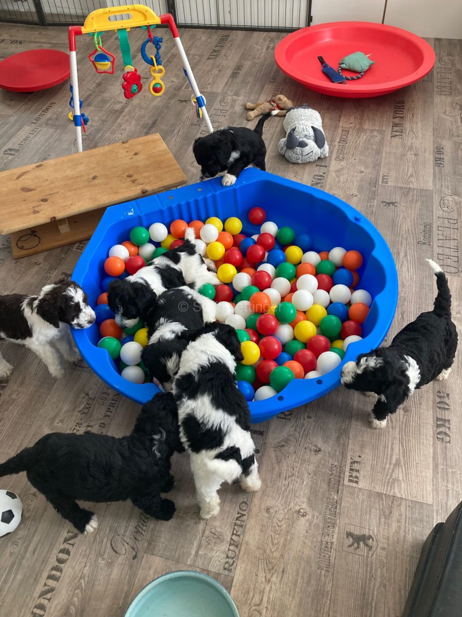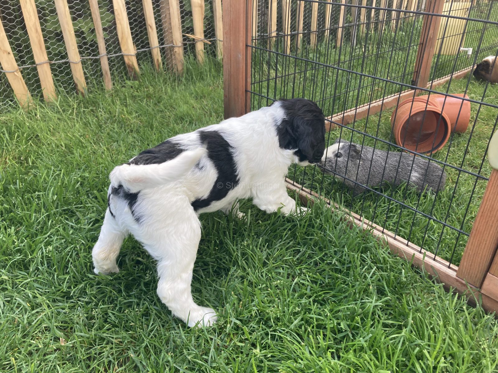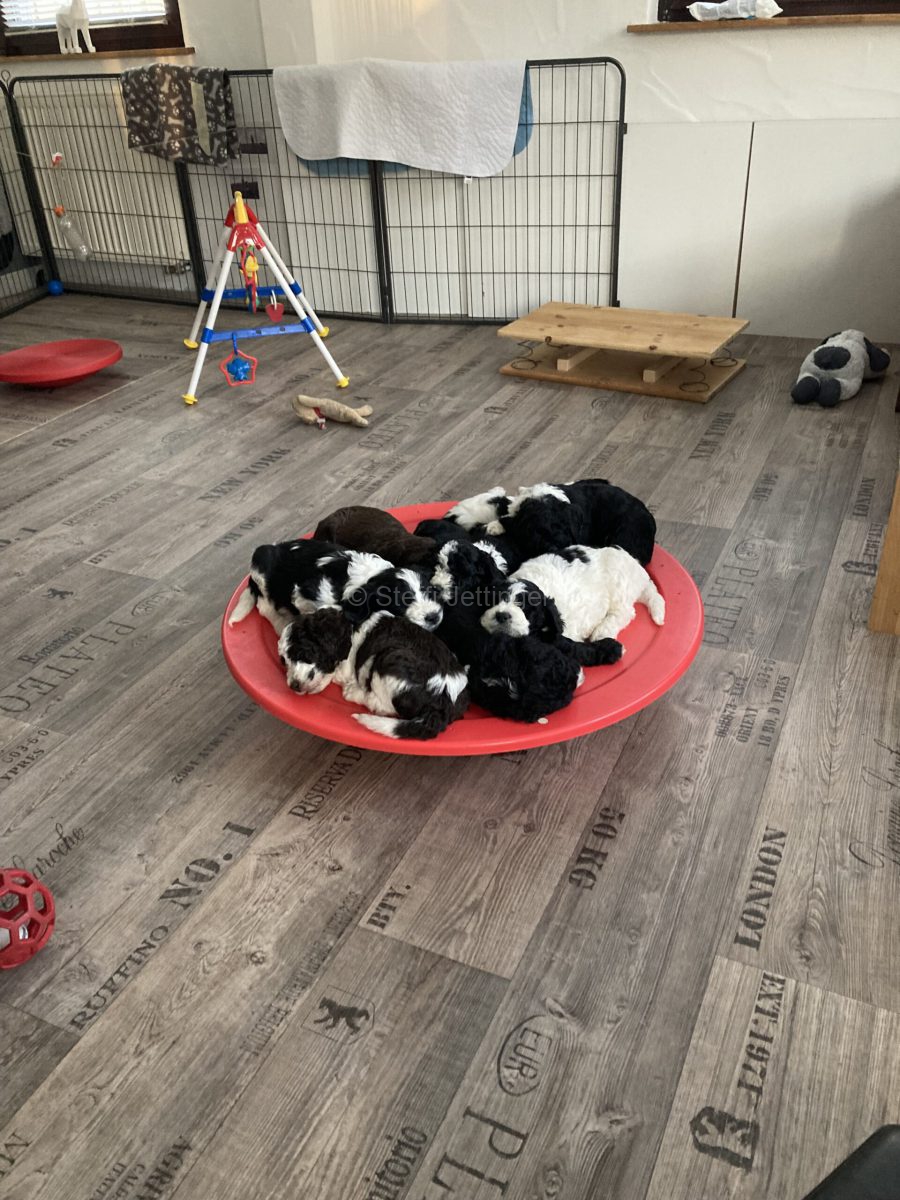 Meine Welpen wachsen Mitten in unserem Familienleben auf. Hier lernen Sie schon im vertrauten Welpenauslauf verschiedene Alltagsgeräusche wie z. B. Spülmaschine, Kochgeräusche, Staubsauger, Türklingel, Radio, TV und vieles mehr kennen.
