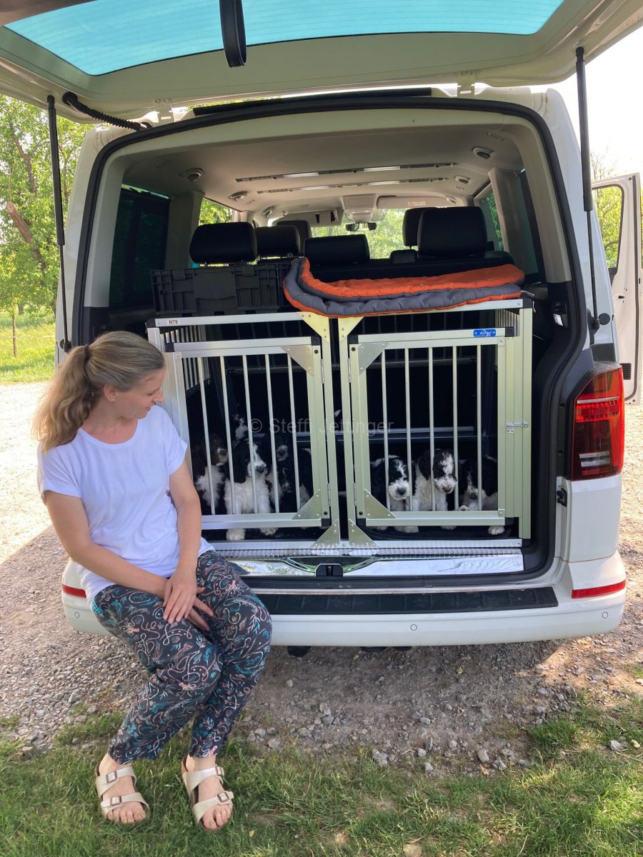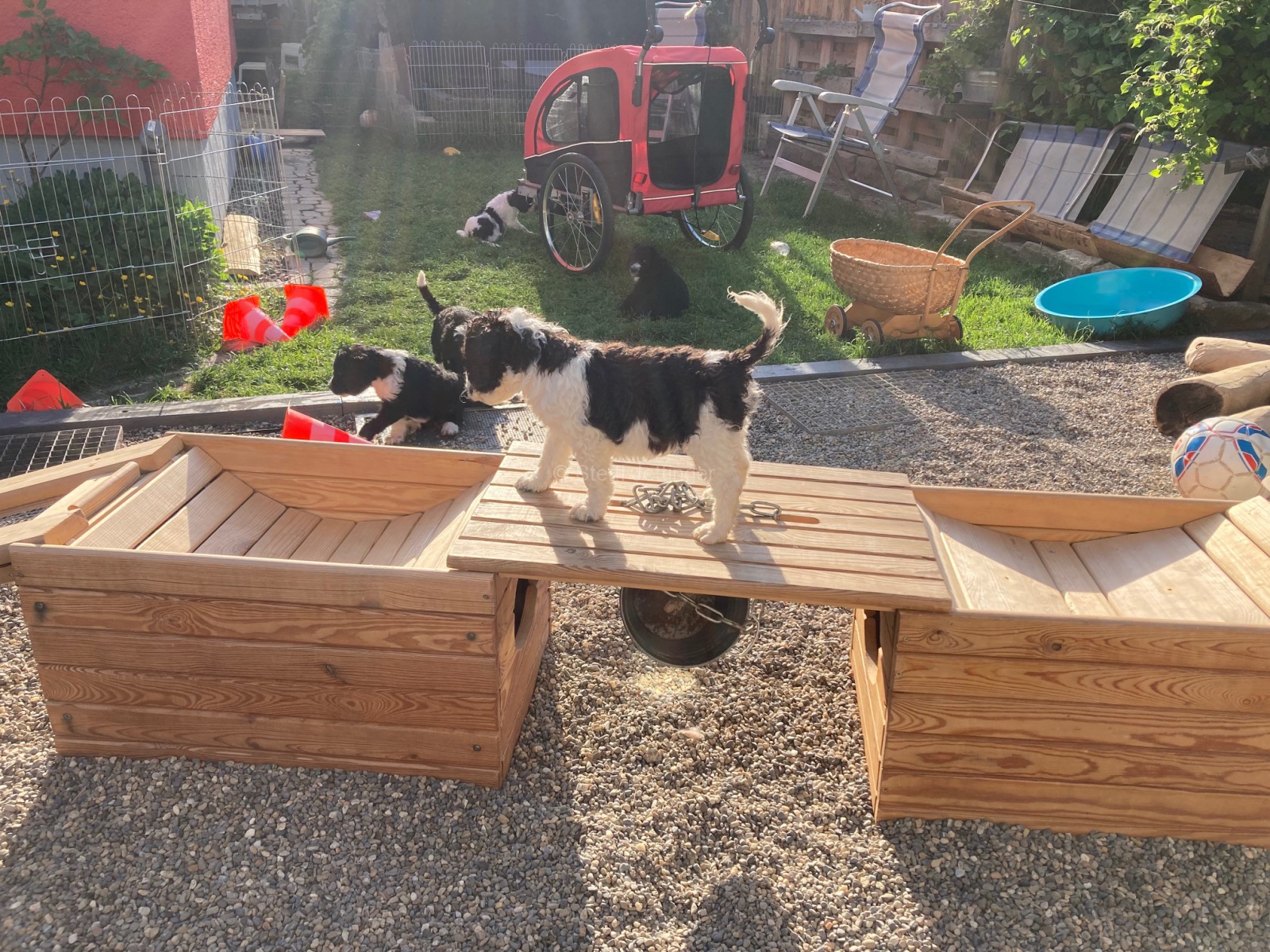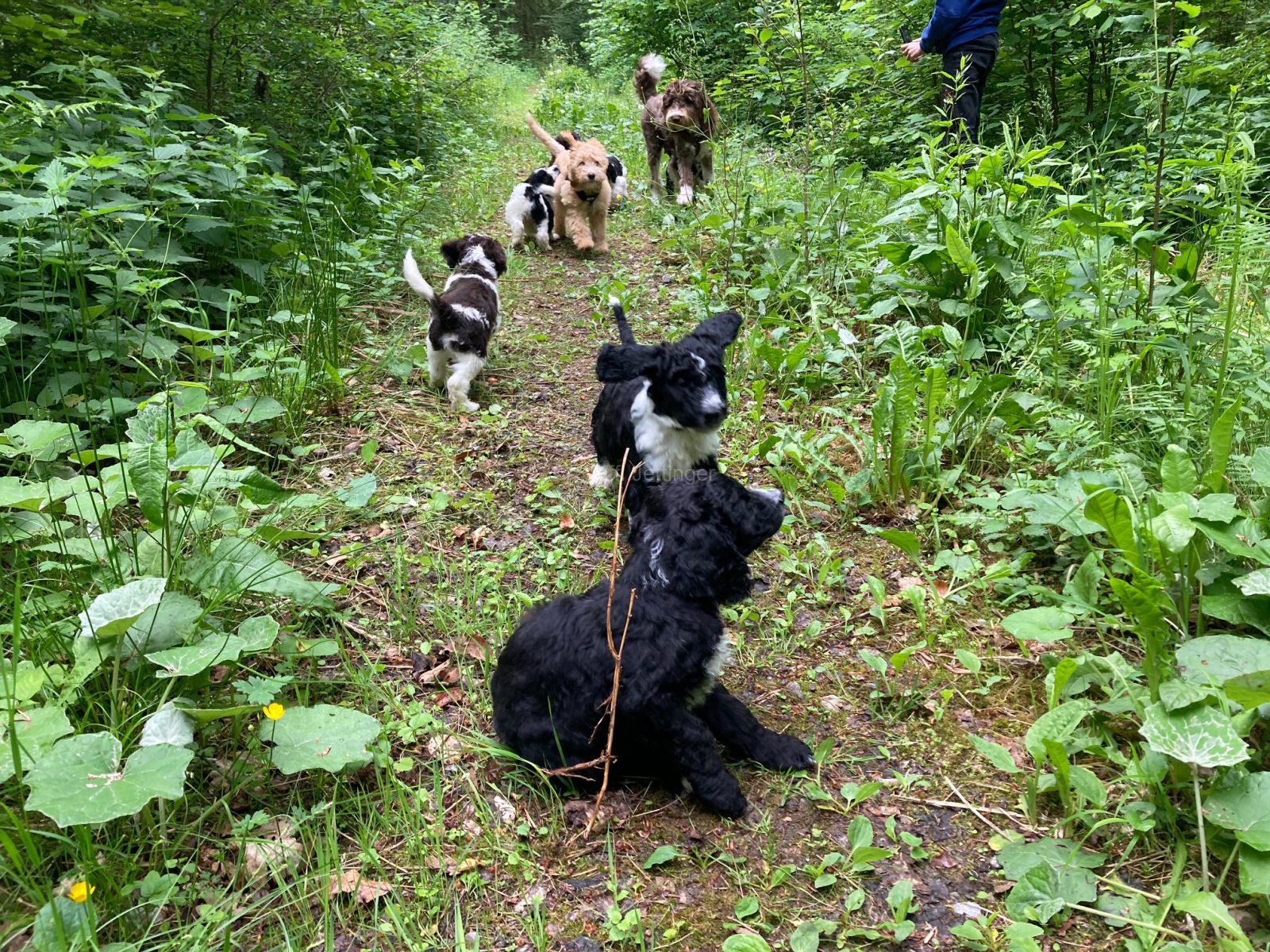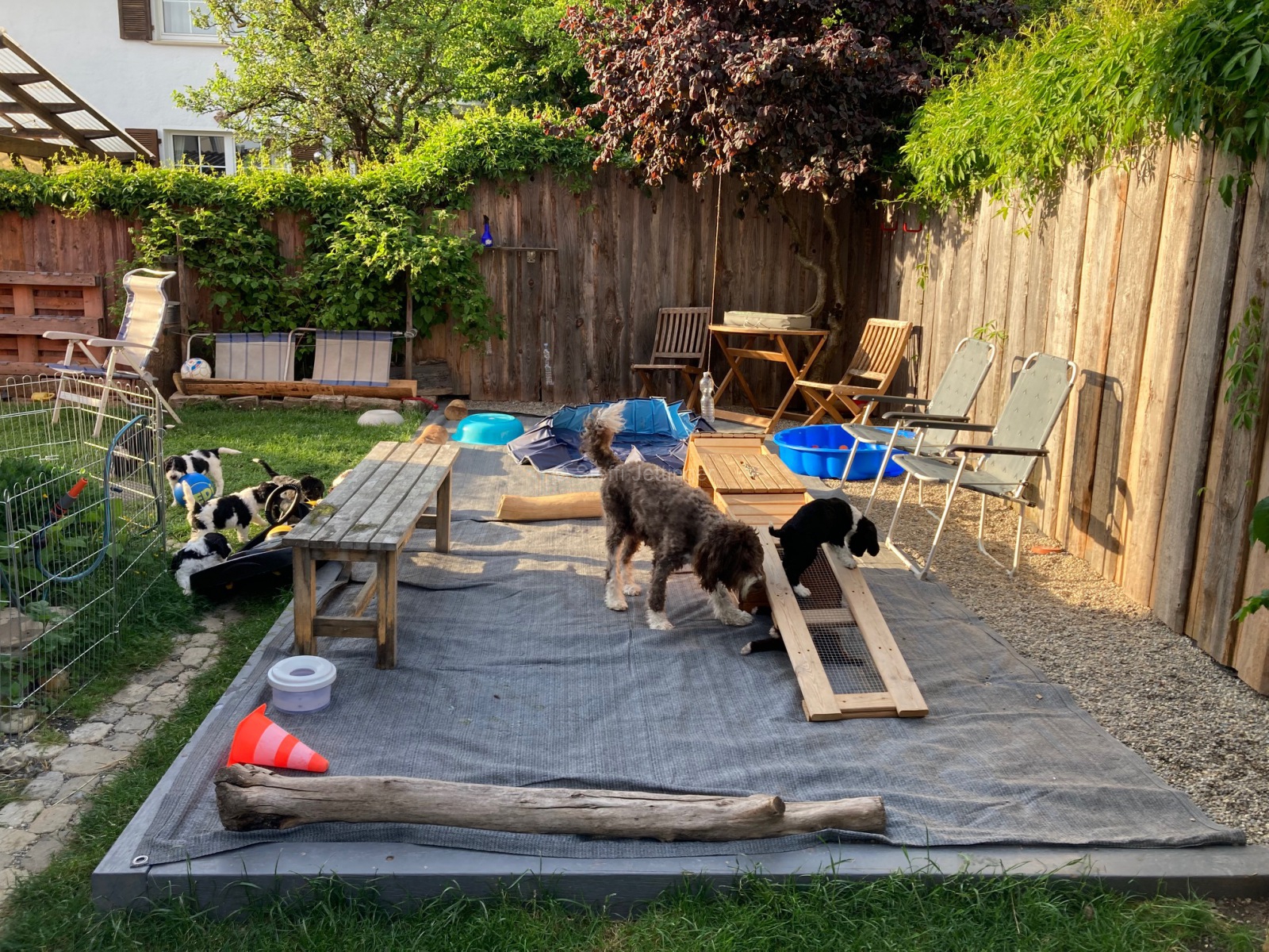 Eine „behütete“ und „reizvolle“ Welpenaufzucht ist mir sehr wichtig! Die Welpen dürfen dosiert spielerisch und ohne Druck in Ihrem Tempo die Welt erkunden. Ausflüge mit dem Auto, in den Wald, in andere Gärten und ans Wasser sind unter anderem für eine gute Prägung für mich unabdingbar, damit sie zu wesensfesten und freundlichen Hunden heranwachsen können.