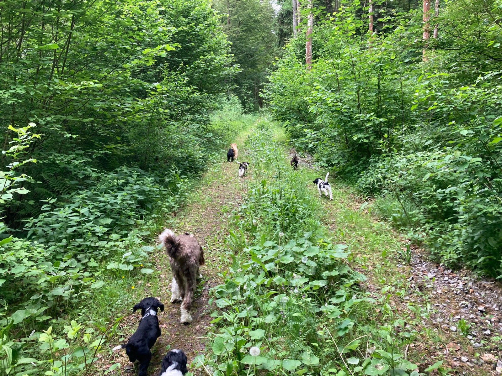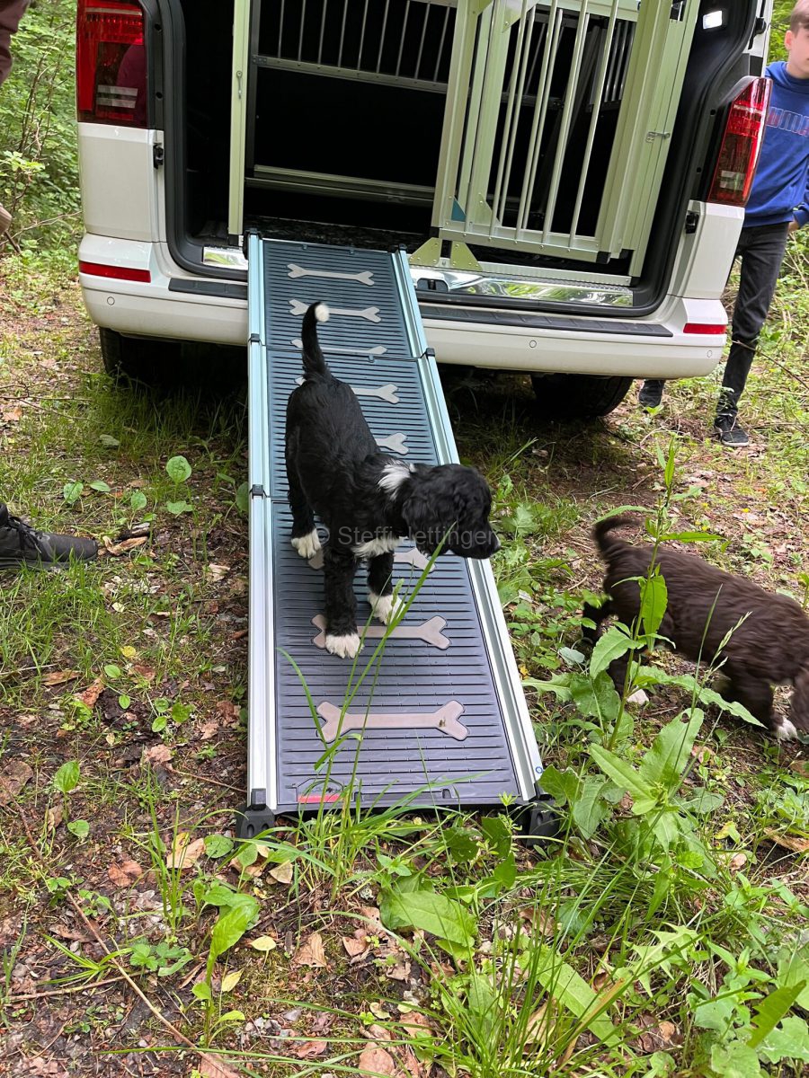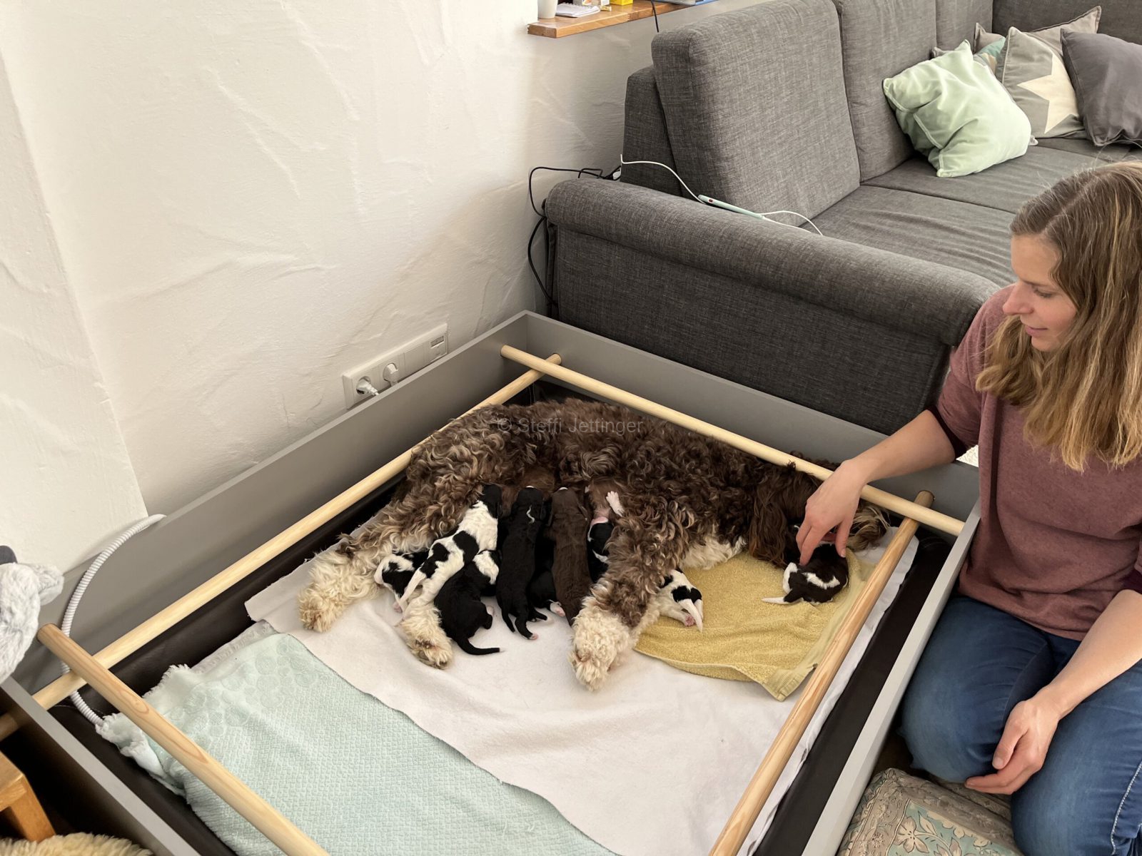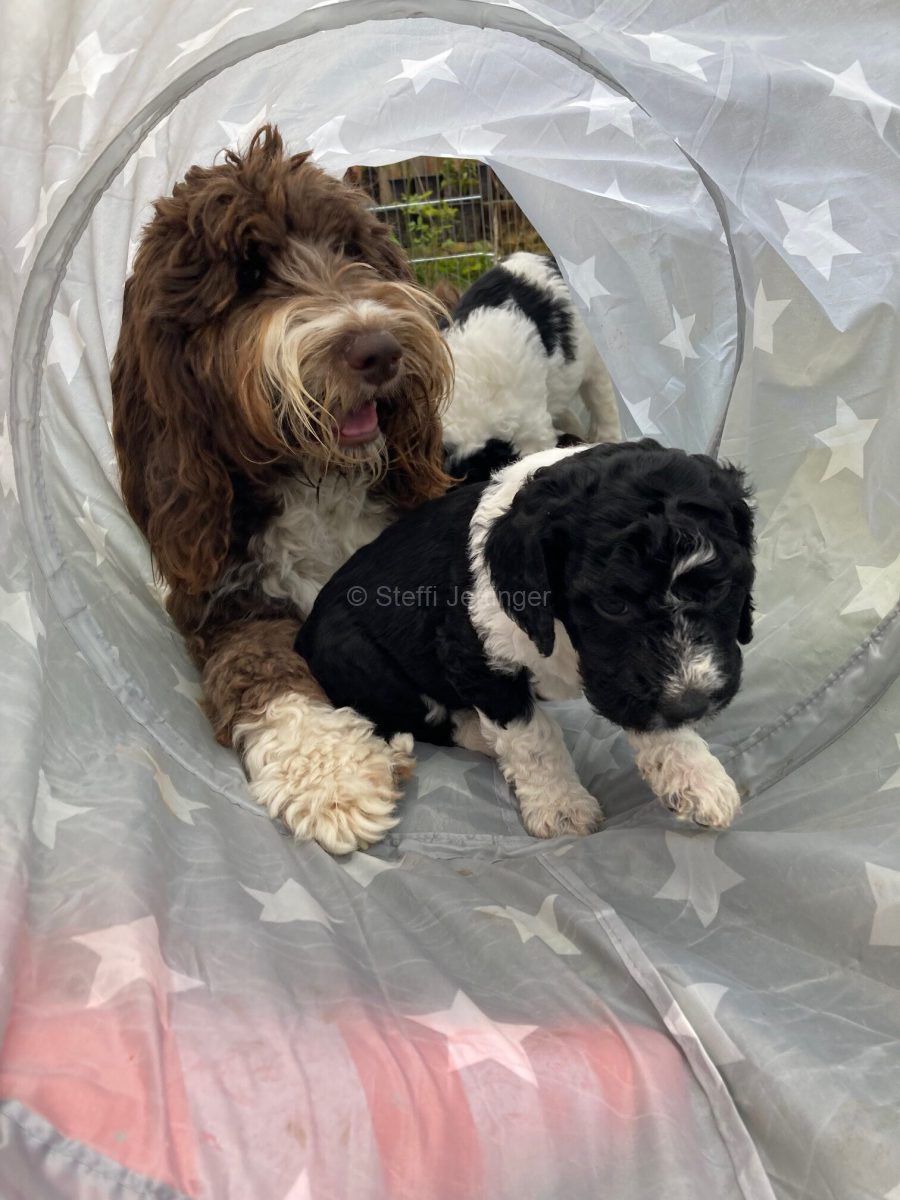 Eine „behütete“ und „reizvolle“ Welpenaufzucht ist mir sehr wichtig! Die Welpen dürfen dosiert spielerisch und ohne Druck in Ihrem Tempo die Welt erkunden. Ausflüge mit dem Auto, in den Wald, in andere Gärten und ans Wasser sind unter anderem für eine gute Prägung für mich unabdingbar, damit sie zu wesensfesten und freundlichen Hunden heranwachsen können.